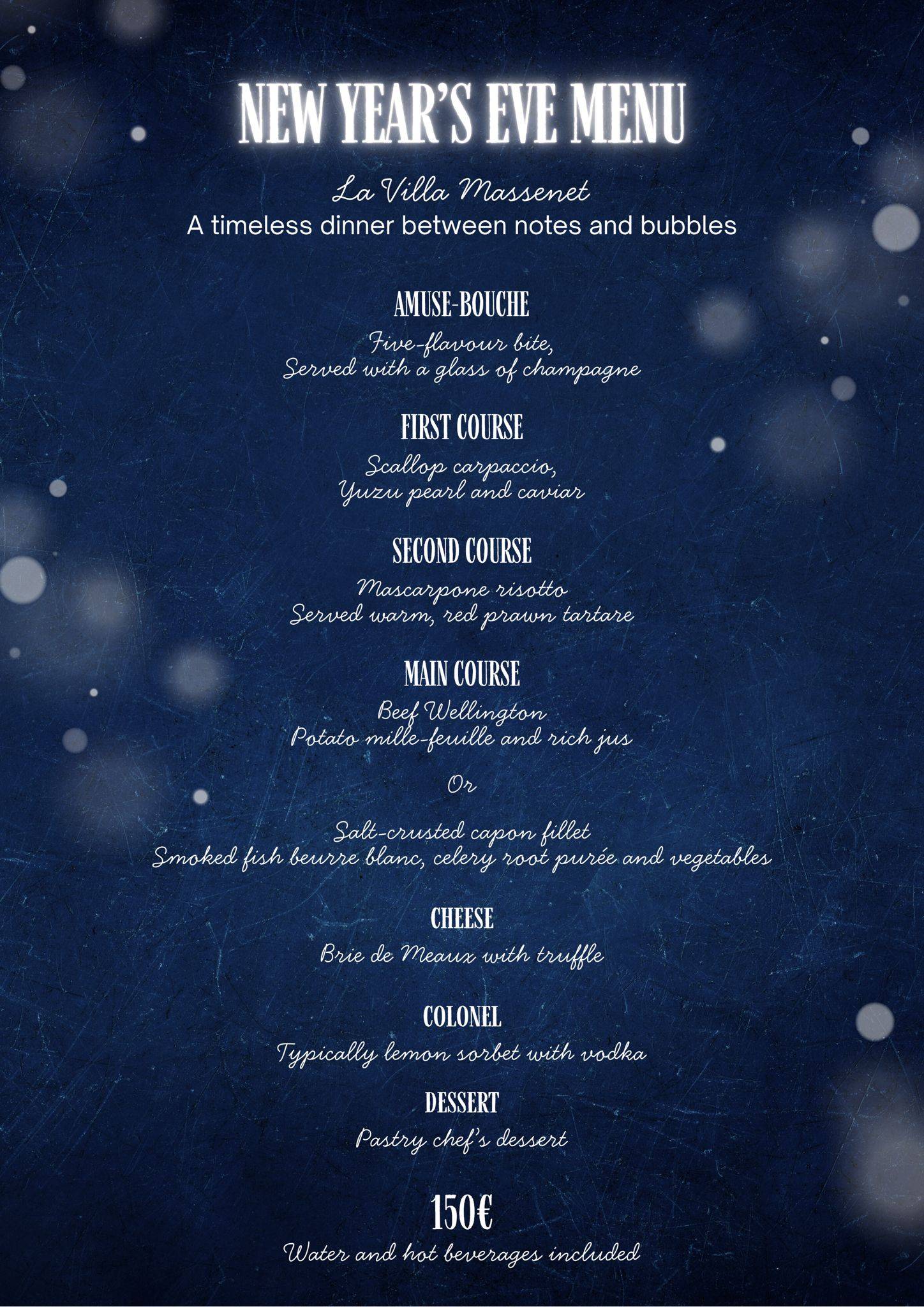 L'équipe de la Villa Massenet vous propose sa soirée du Nouvel An avec un menu conçu spécialement pour cet évènement !